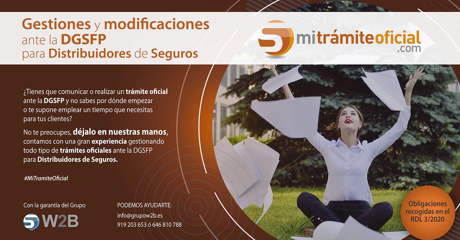 Grupo W2B, especialista en la prestación de servicios auxiliares para distribuidores de seguros ha lanzado la marca “mitrámiteoficial.com” desde la que se encarga de realizar todo tipo de gestiones y trámites oficiales para la comunicación de cambios ante la Dirección General de Seguros y Fondos de Pensiones para los distribuidores de seguros.
